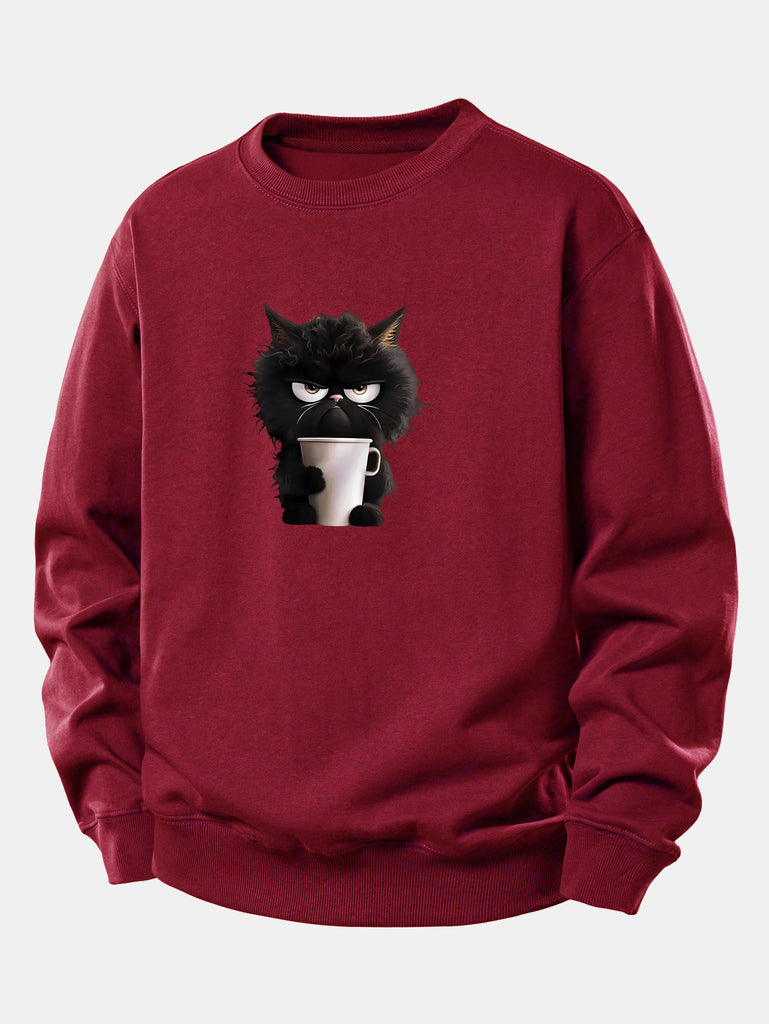 Φούτερ Χαλαρή Γραμμή με Σχέδιο Μαύρη Γάτα που Πίνει Καφέ