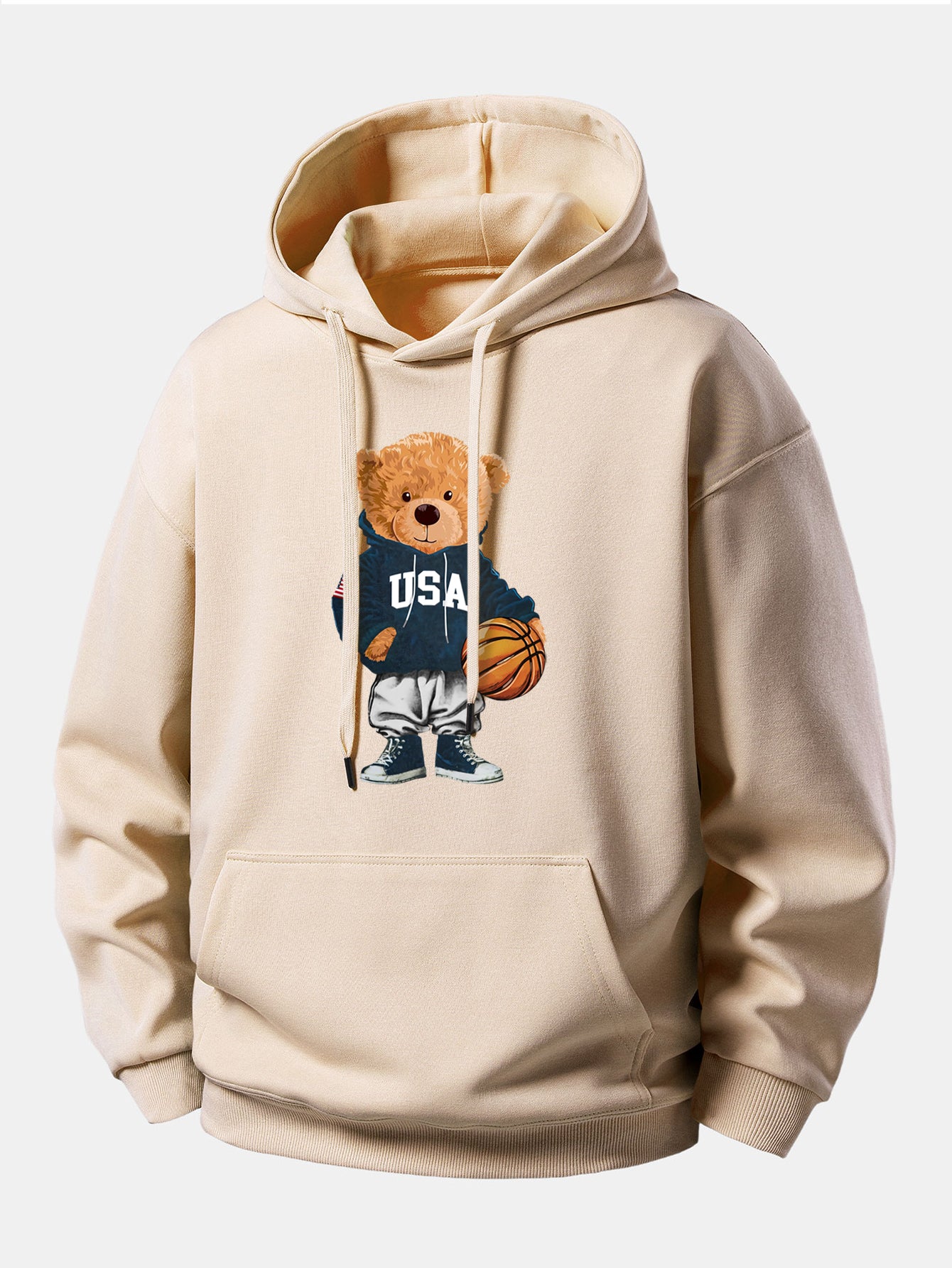 Add a fun, sporty vibe to your casual wardrobe with this basketball bear print relax fit drawstring hoodie. Featuring a playful bear graphic dressed in basketball gear, this hoodie brings a unique combination of athletic style and cute streetwear attitude.